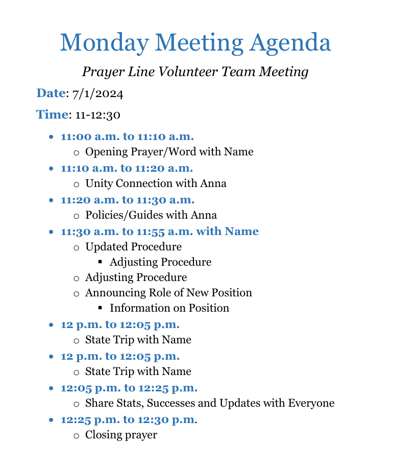 I helped lead weekly meetings with the Prayer Line Volunteer Team by creating a short devotional, a team-building connection activity, and keeping track of time. To increase time management and efficiency, I helped create an updated meeting agenda with time stamps and kept meeting minutes for management’s reference. Included in this section is an example meeting agenda I used without sensitive information.
