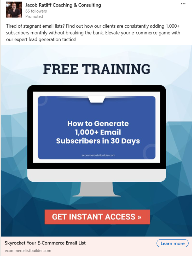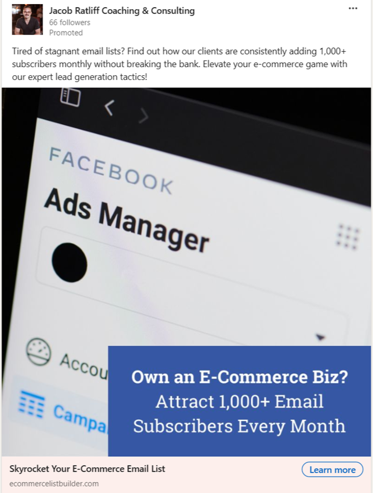 Goal: To reach the target audience of e-commerce entrepreneurs with Jacob Ratliff’s offer of increasing email subscribers through his marketing services.