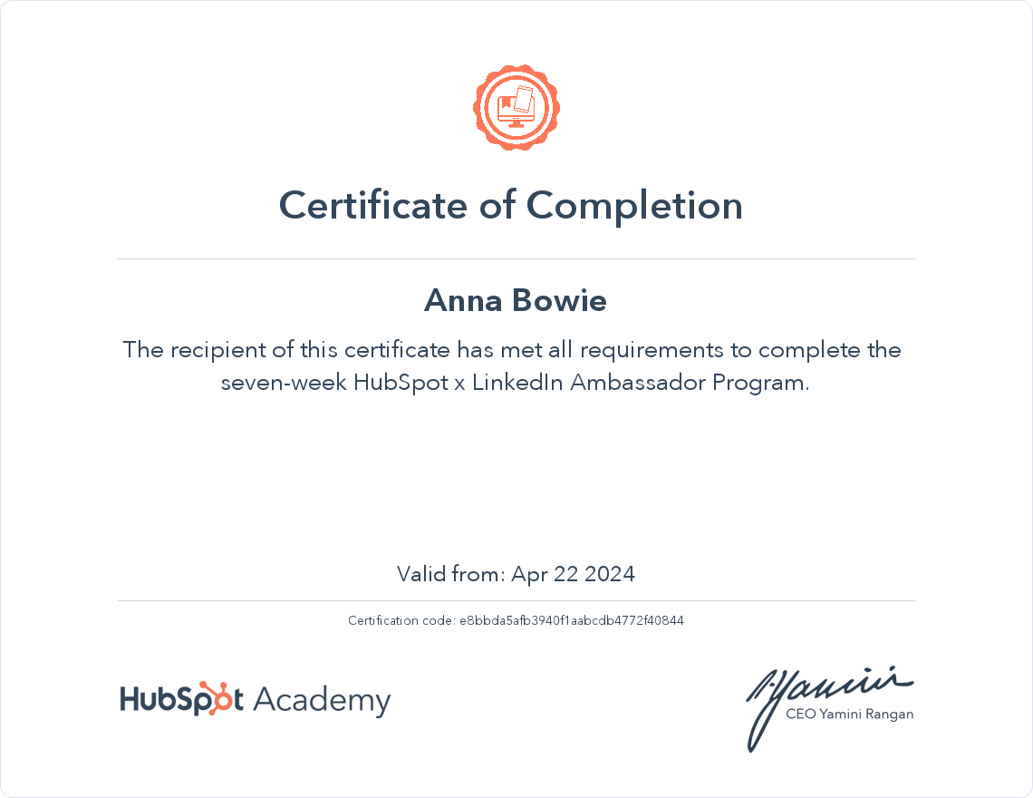 I had the opportunity to work with HubSpot and LinkedIn for their micro-internship Ambassador program. Through this position, I attended training sessions on inbound marketing and LinkedIn-specific marketing and earned several HubSpot and LinkedIn certifications.